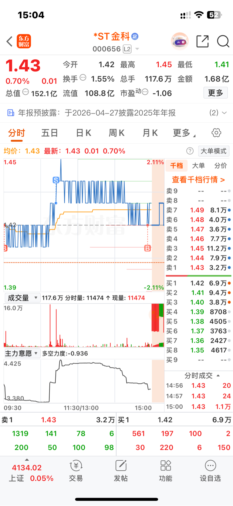 今天完全是主力给发红包,可惜1.43挂单忘记撤了,不然1.44可以卖出。尾盘1.