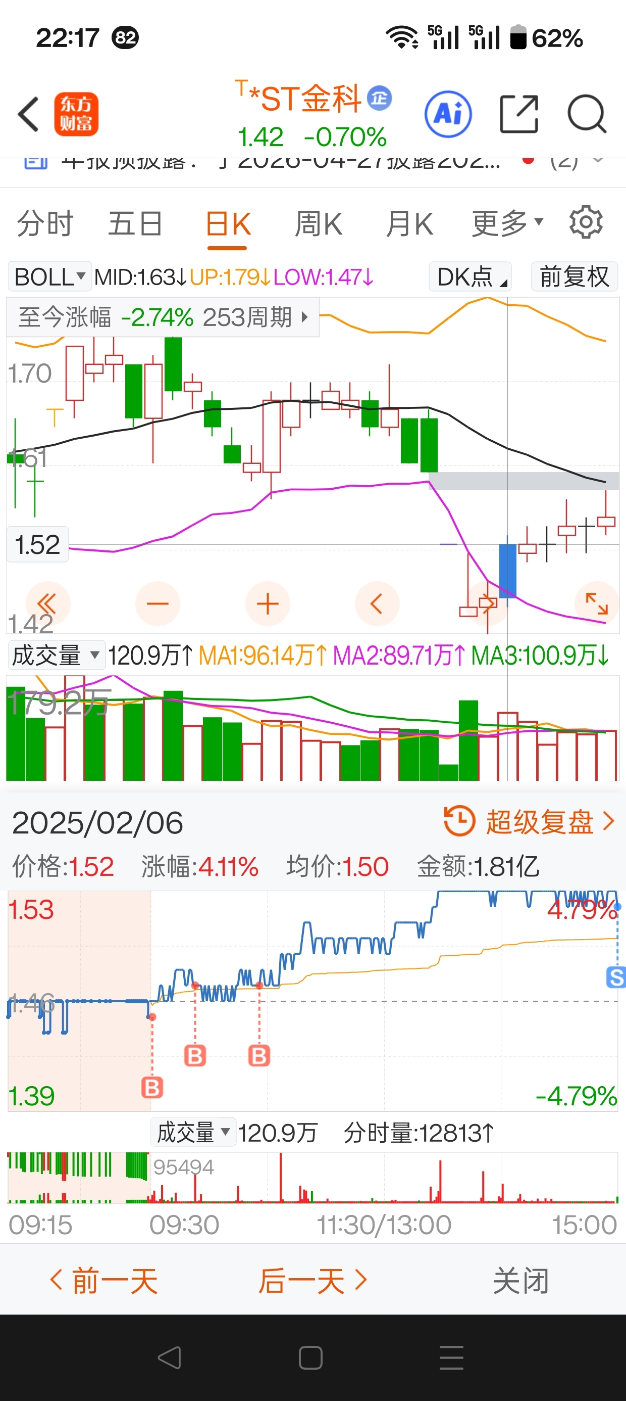 $*ST金科(SZ000656)$ 去年春节前,买入金科,吃了两个跌停,节后最低价打到1.42,随后反弹。今年,春节前,买了1.42,这次吸取教训,少买点,年后加仓,然后看这个股价上涨。还是那句话,不涨不买,再涨就卖。看去年年后股价走势,截图。
