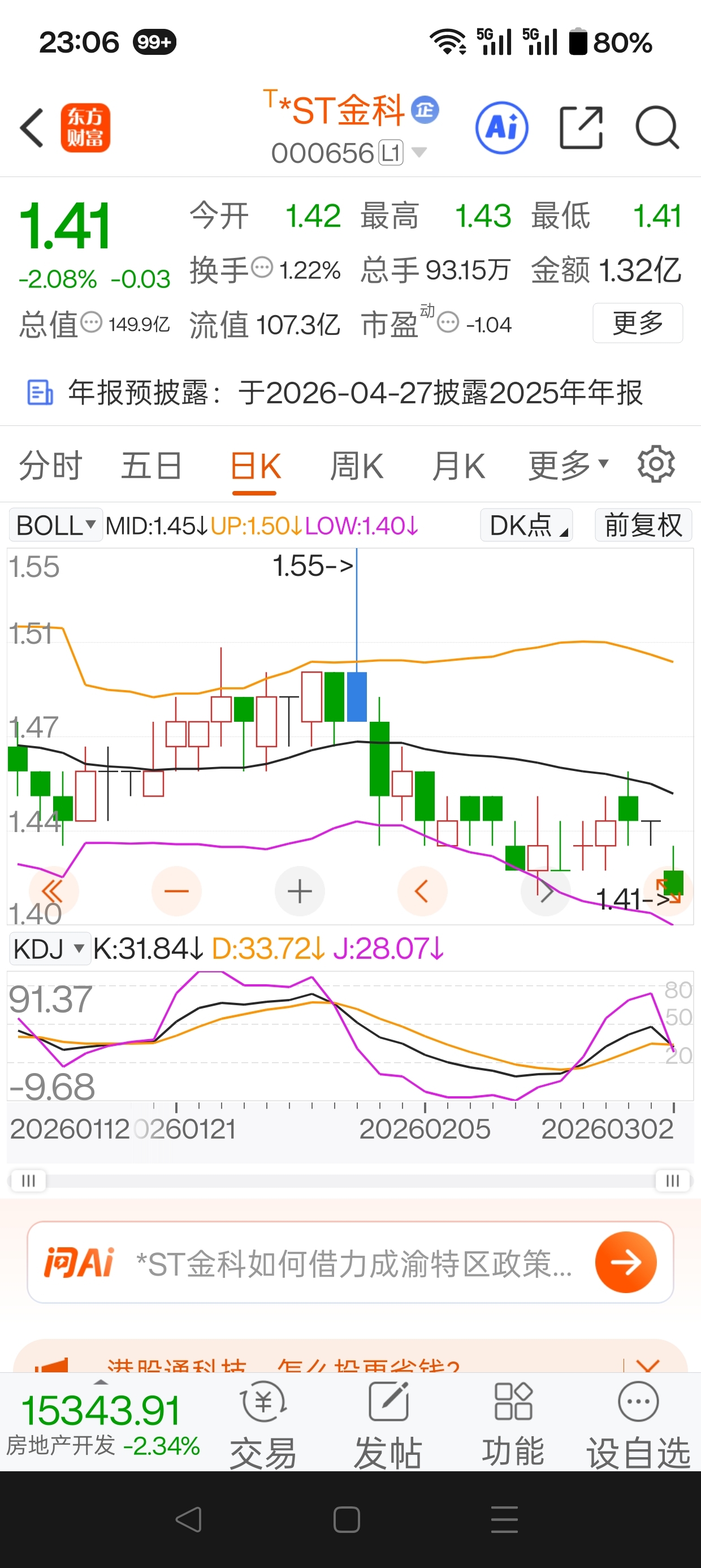 $*ST金科(SZ000656)$ 股价摸到下轨线会有反弹,kdj死叉向下,还要往下走一段时间。提醒大家的是,战争就是利空,利空总要发酵。2022年2月24日前后,大盘走势大家可以对照的看一看。当天分时图,中午10点55分,战争爆发。