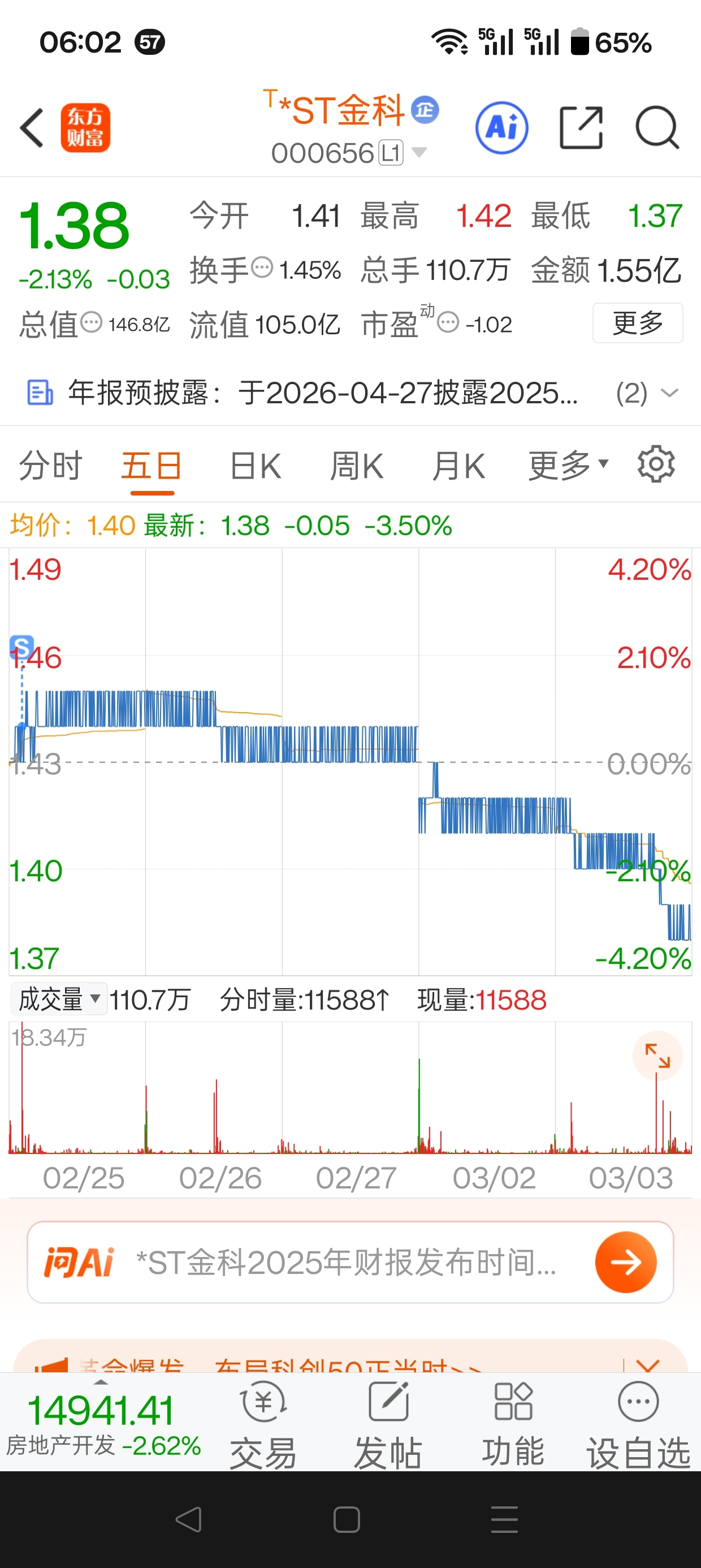 $*ST金科(SZ000656)$ 金科一旦有新的低点出现,你就买入保证赚钱。年前,出现新低1.41够,股价迅速反弹到1.45。年后,股价见到1.35后,上周五反弹到1.41,你要是1.36买入,那不就赚钱了吗?今天可以轻松卖掉1.37赚一分钱呢。
