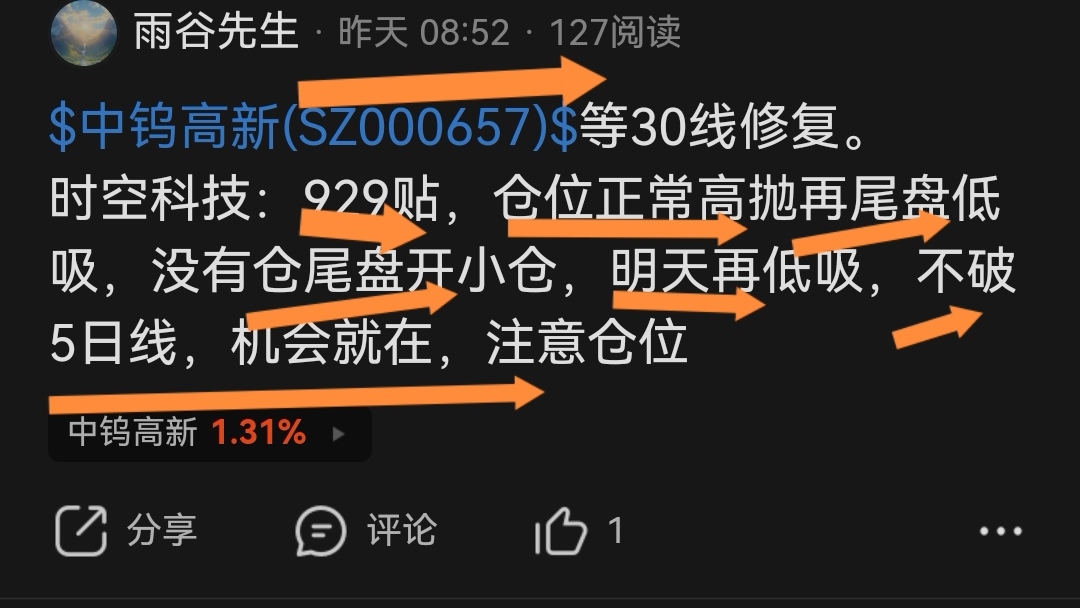 恭喜关注的常看贴股友中乌:太大,等国庆后。调仓:时空科技周一没有开盘发贴,开局杀