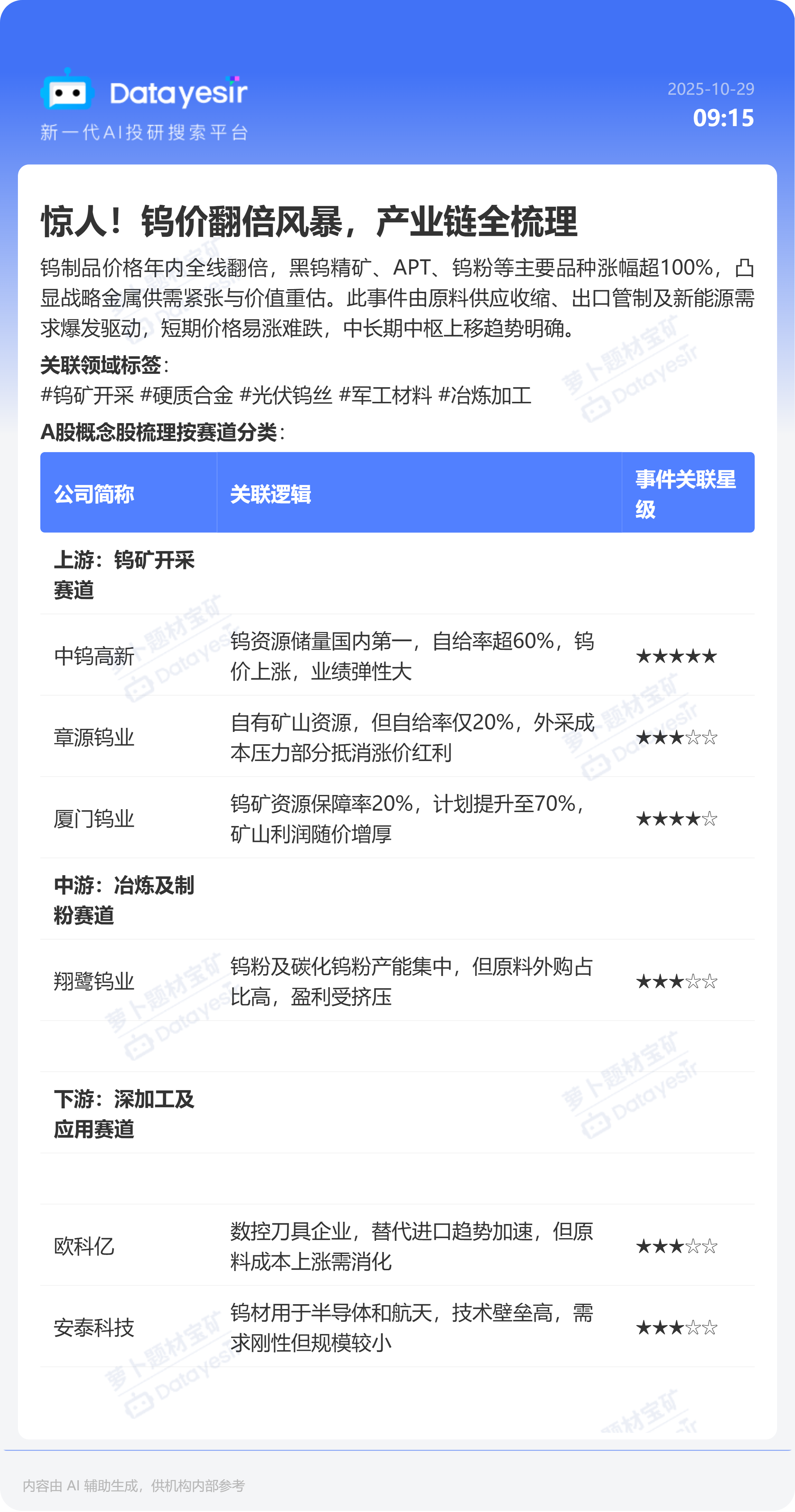 钨制品价格年内全线翻倍,黑钨精矿、APT、钨粉等主要品种涨幅超100%,凸显战略金属供需紧张与价值重估。