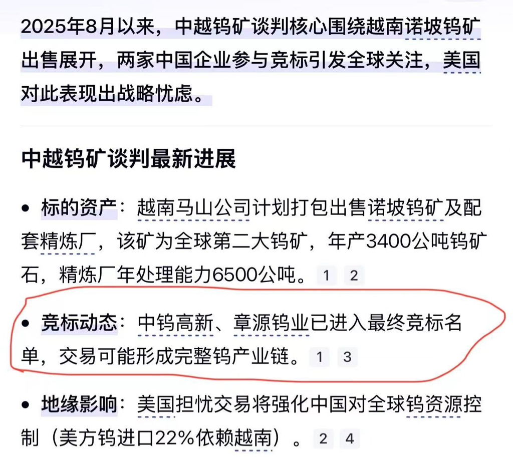 $中钨高新(SZ000657)$ $鼎泰高科(SZ301377)$ 越南钨矿竞标结果应该快出炉了吧!中钨如果中标那不火上浇油!