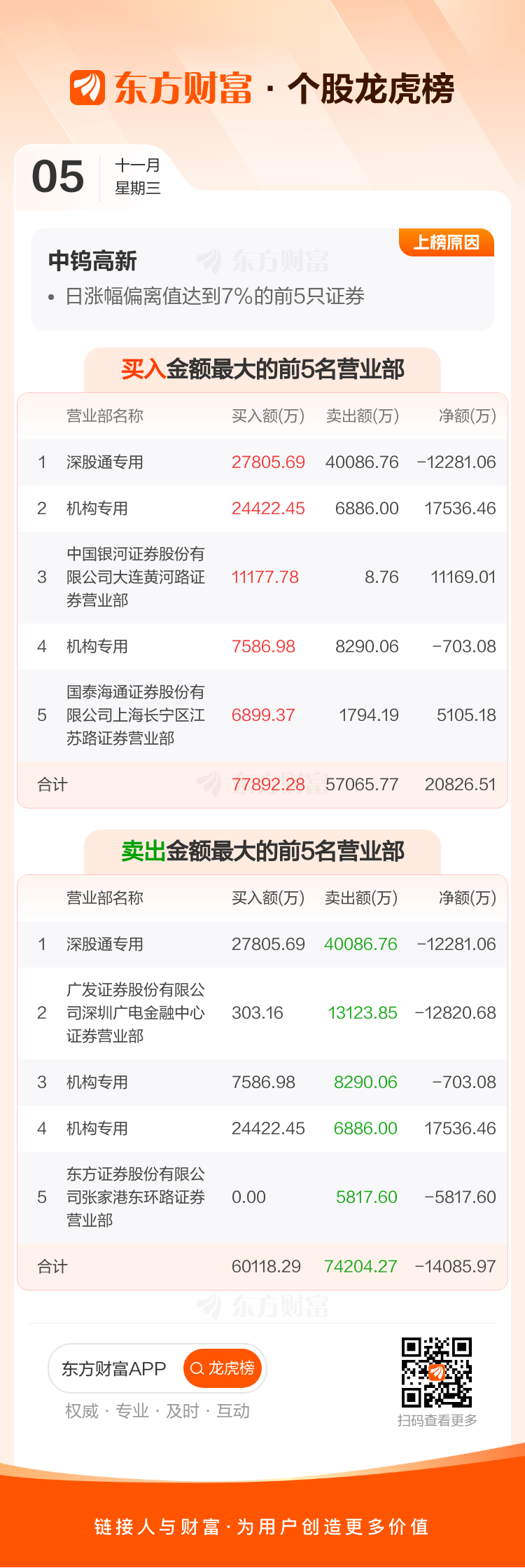 交易所2025年11月5日公布的交易公开信息显示,中钨高新因成为日涨幅偏离值达到7%的前5只证券上榜。中钨高新当日收报25.05元,涨跌幅10.01%,偏离值9.55%,换手率12.18%,成交额41.76亿。