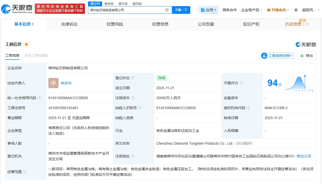 每经AI快讯,天眼查App显示,近日,郴州钻石钨制品有限公司成立,法定代表人为申志均,注册资本3亿元人民币,经营范围包括常用有色金属冶炼、稀有稀土金属冶炼、有色金属合金制造、有色金属压延加工。股东信息显示,该公司由中钨高新(000657)全资持股。