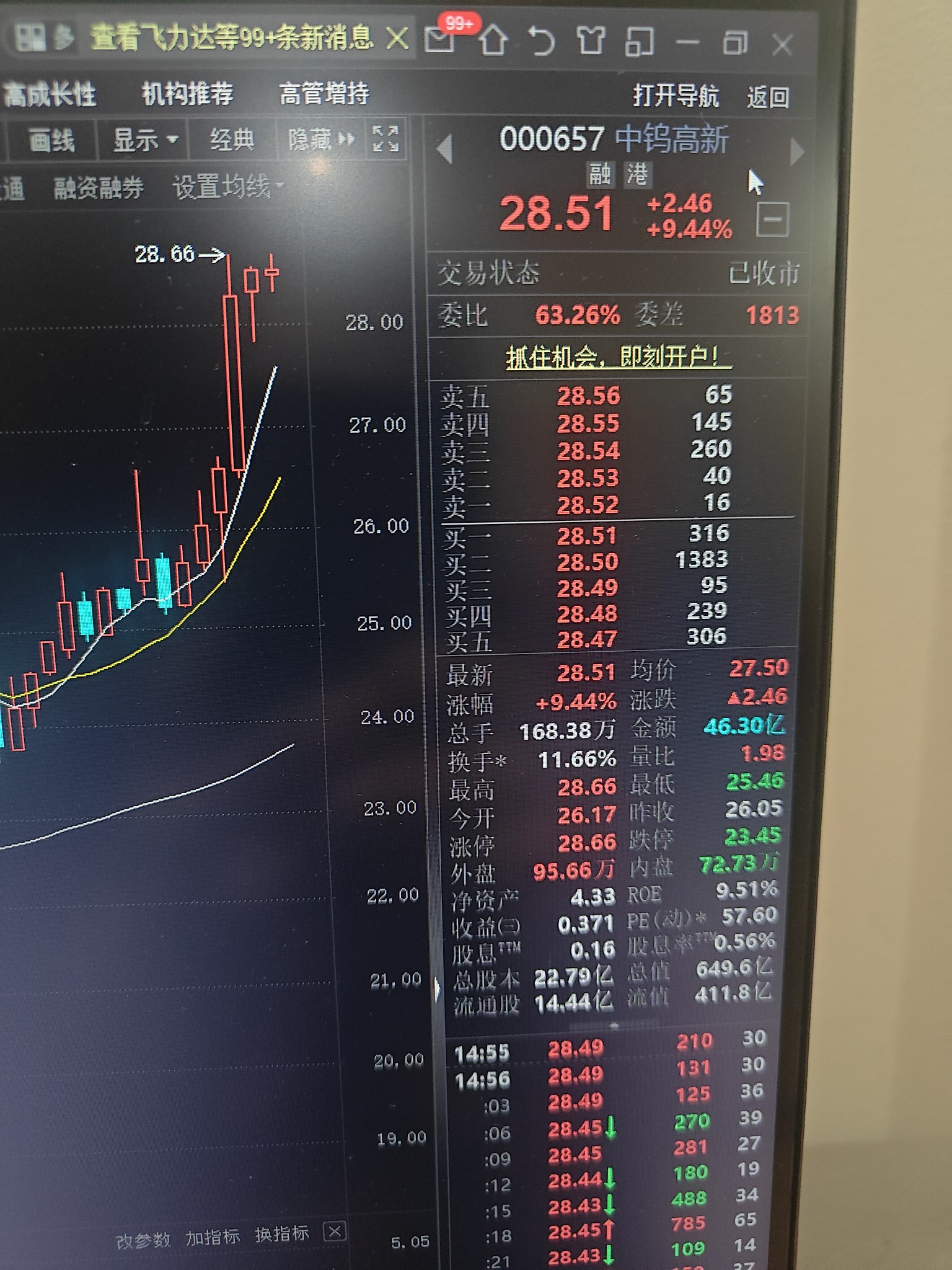 $中钨高新(SZ000657)$ 在网上自学的分钟线。在我设置的分钟线以上。黄白两个线也是向上。短期看是上涨的。此评价作为我学习的一个观点。