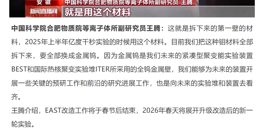 这个算官宣吗?中国科学院合肥研究院等离子体所2026年1月4日08:00安徽,要全部换成金属钨