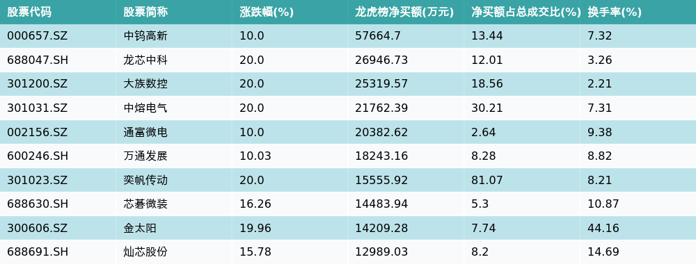南财智讯1月21日电,南财金融终端数据显示,因当日异动登上龙虎榜的个股中,资金净买入最多的前三位分别是中钨高新(000657.SZ)、龙芯中科(688047.SH)与大族数控(301200.SZ)。其中排名第一的中钨高新净买额达5.77亿元,占总成交金额的13.44%。中钨高新当日收盘上涨10.0%,换手率为7.32%,净买入额前10个股详情见下图: