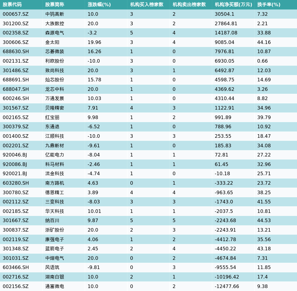 南财智讯1月21日电,南财金融终端数据显示,因当日异动登上龙虎榜的个股中,30只沪深A股龙虎榜出现了机构的身影,机构合计净买入64454.37万元,具体来看,机构净买入17只个股,净卖出13只个股。其中,机构净买入前三分别为中钨高新(000657.SZ)、大族数控(301200.SZ)与森源电气(002358.SZ),详情见下图:机构净卖出的个股中,前三分别为通富微电(002156.SZ)、湖南白银(002716.SZ)与风语筑(603466.SH)。