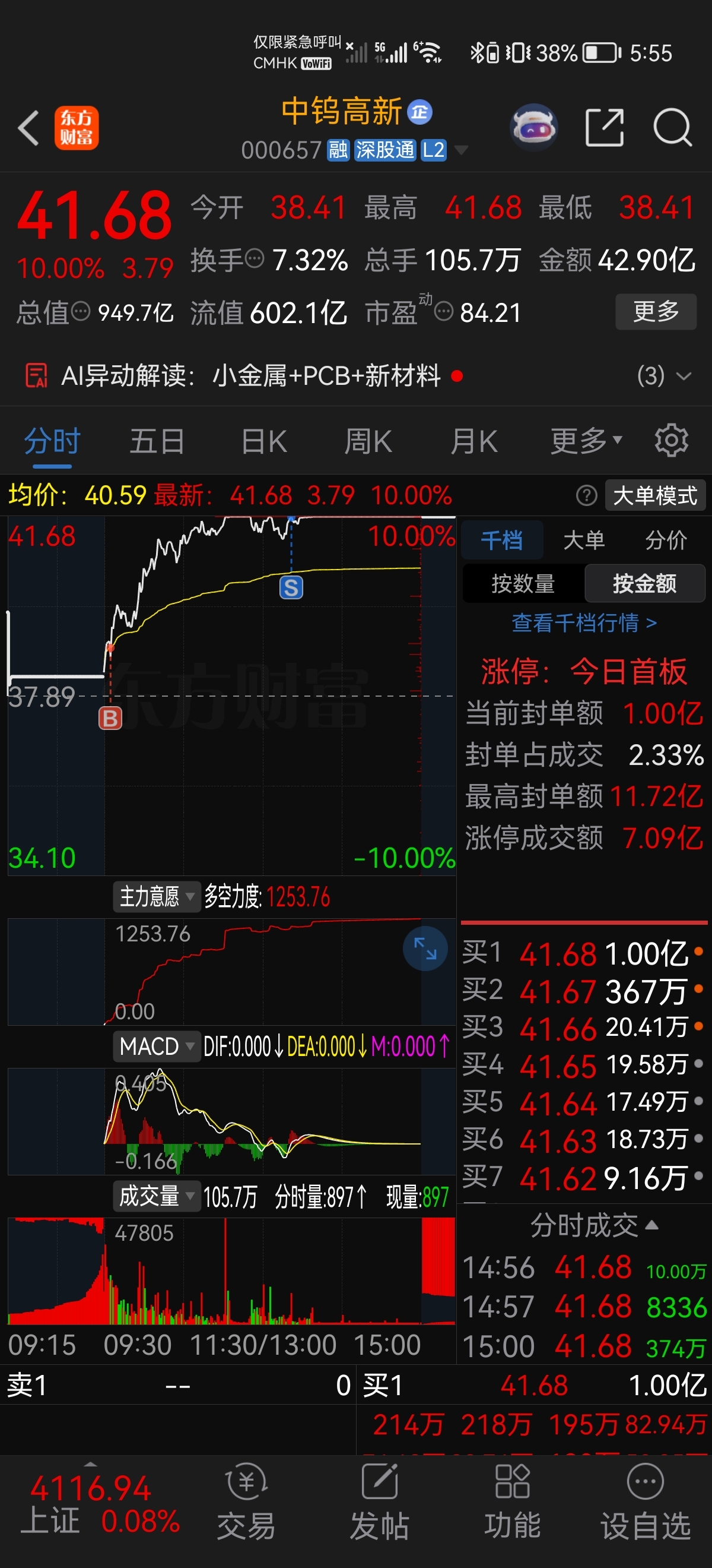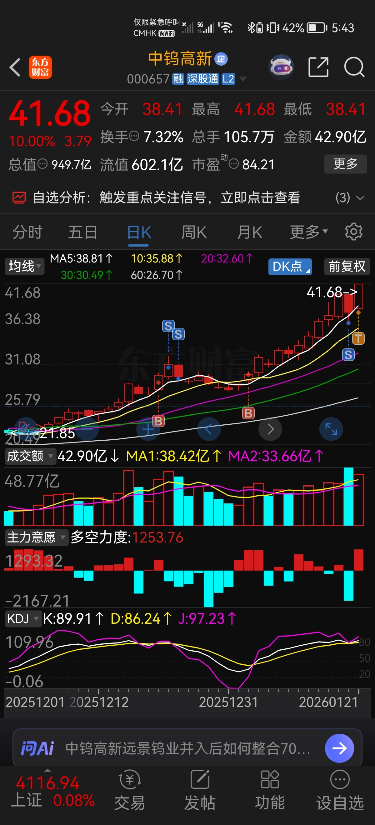 $中钨高新(SZ000657)$ #炒股日记# 昨日被洗下车一半,今天早盘一看异动,赶快纠错,补回,上板磨叽,出了补仓的一半。