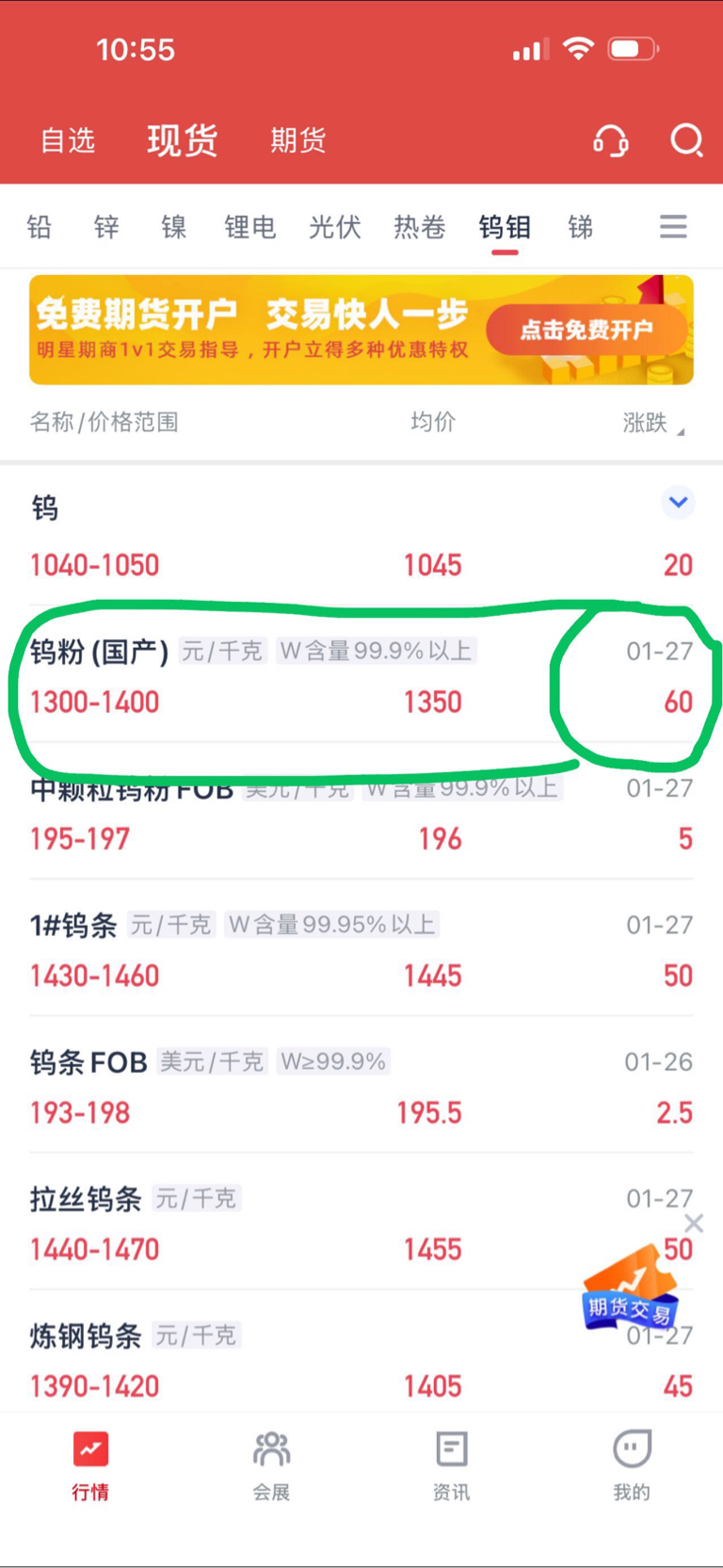 出现了恐怖的涨幅!这个软件看到今天上午钨粉一吨涨六万!太恐怖了。今天钨必须集体涨
