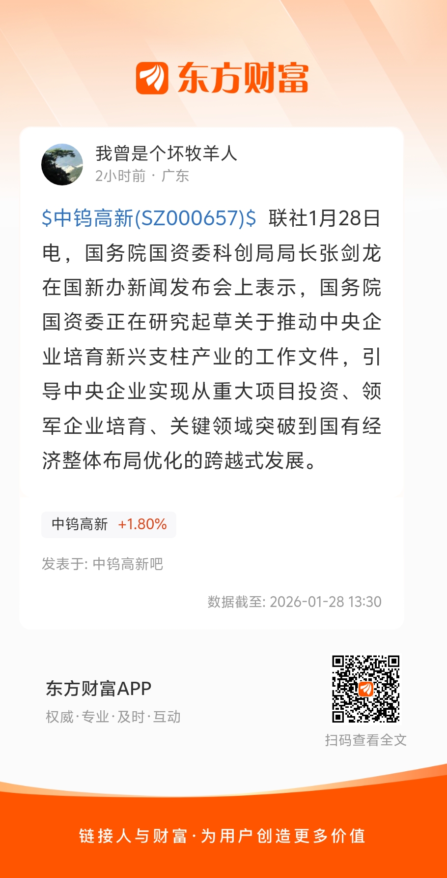 $中钨高新(SZ000657)$ 联社1月28日电,国务院国资委科创局局长张剑龙在国新办新闻发布会上表示,国务院国资委正在研究起草关于推动中央企业培育新兴支柱产业的工作文件,引导中央企业实现从重大项目投资、领军企业培育、关键领域突破到国有经济整体布局优化的跨越式发展。