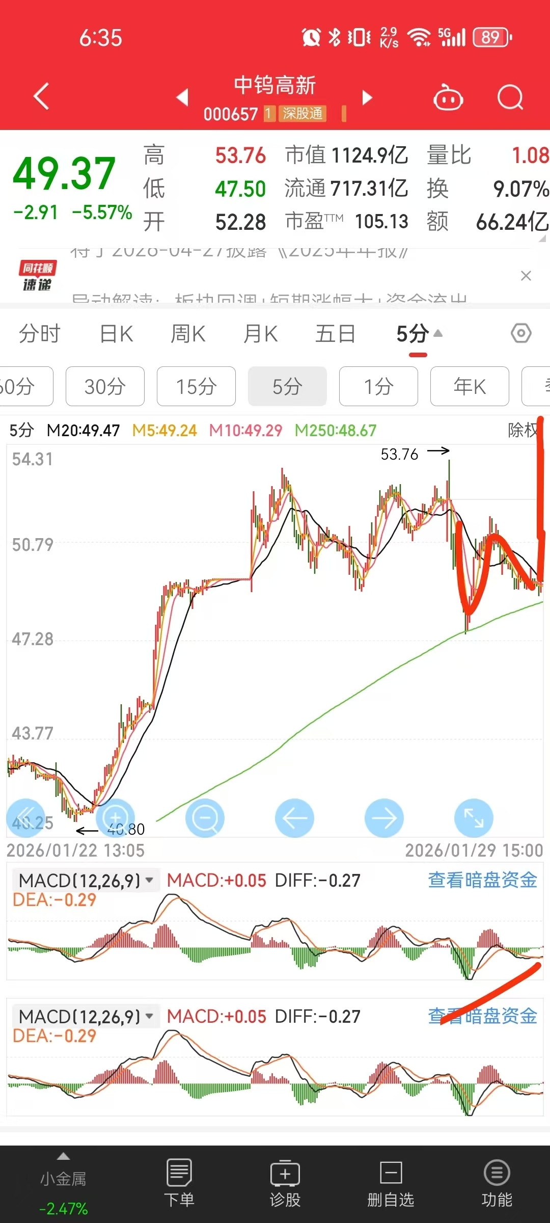 这里一个5分钟的盘整,若是跳空低开,结合周线,此股到顶了。结合钨粉持续上涨,明天