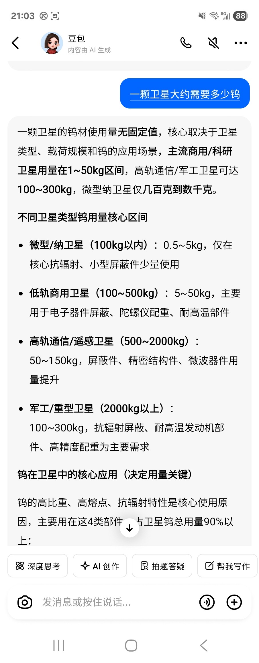 马斯克申请未来发射100万颗卫星,卫星与火箭用钨核心在高温部件(喷嘴、耐高温结构件),按最低用量标准算:单颗卫星最低用钨约15kg,单枚运载火箭最低用钨约50kg;100万颗卫星+100万枚火箭,总最低用钨量=65000吨。 注:此为极端下限值!!