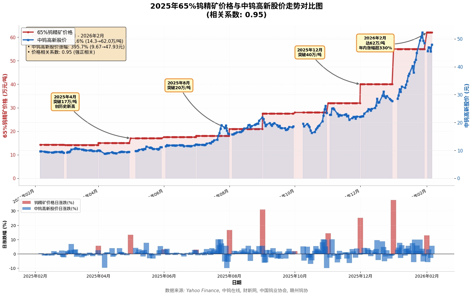下图是由kimi制作的2025年以来65%钨精矿价格叠加中钨高新股价变化的走势图