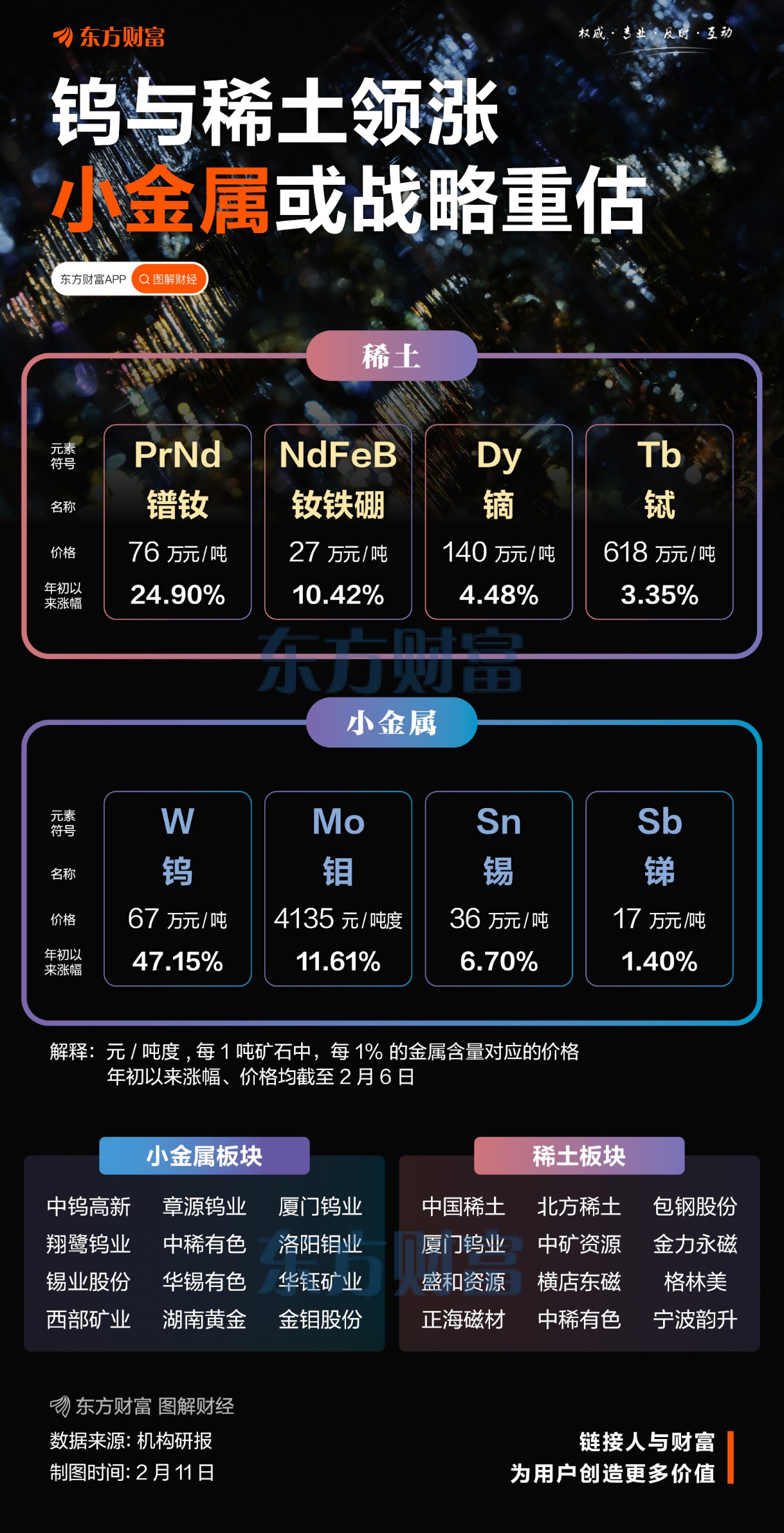 先看小金属,2月11日,中钨高新、东方钽业、翔鹭钨业、章源钨业、北矿科技涨停;厦门钨业、金钼股份、北方稀土等龙头也涨幅靠前。