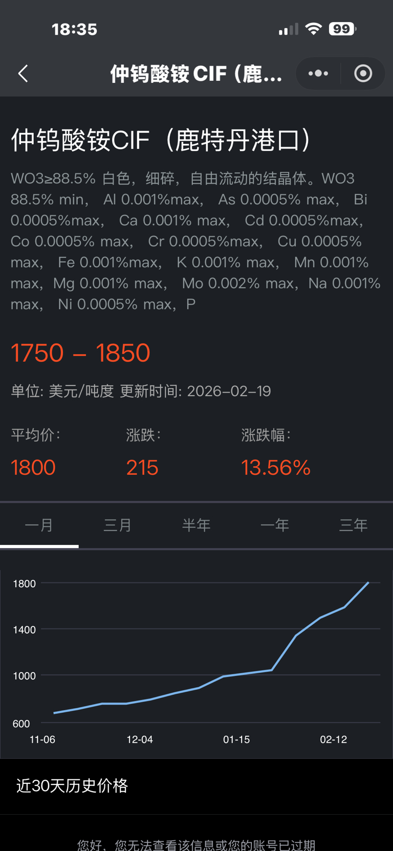 春节期间国外钨金大涨。期待节后国内钨金报价直接跳涨。