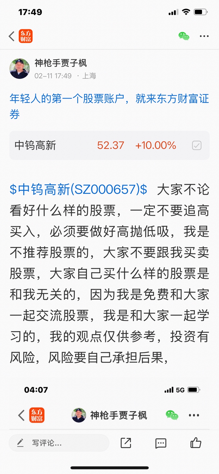 $中钨高新(SZ000657)$ 这个股我是在二月十一号发表文章看涨的股票,这个股在我看好的五大钨王中是排名第四位,我是不推荐股票的,大家不要跟我买卖股票,大家自己买什么样的股票是和我无关的,因为我是免费和大家一起交流股票,我是和大家一起学习的,我的观点仅供参考,不构成任何投资建议,投资有风险,风险要自己承担后果,