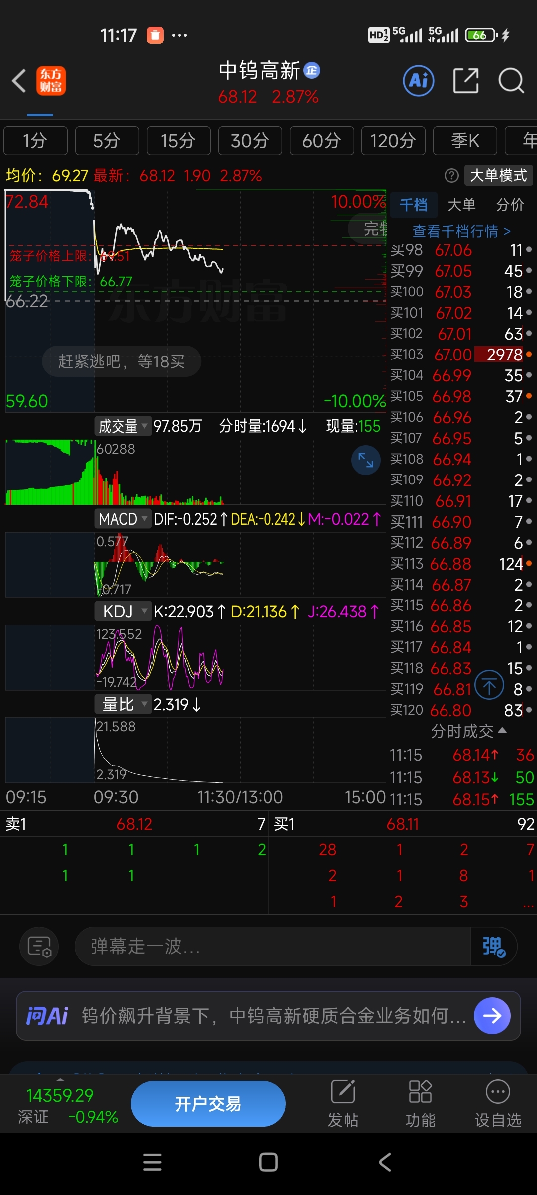 $中钨高新(SZ000657)$ 67托底诱多,必破,上午69和68托底诱多散户买,已经破了两次