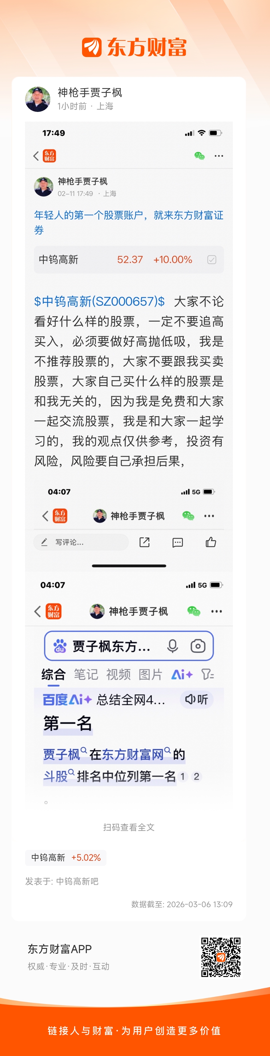 $中钨高新(SZ000657)$ 这个是我二月十一号发表文章看好的第四钨股,我是不推荐股票的,大家不要跟他买卖股票,大家自己买什么样的股票是和我无关的,因为我是免费和大家一起交流股票,我是和大家一起学习的,我的观点仅供参考,投资有风险,风险要自己承担后果,