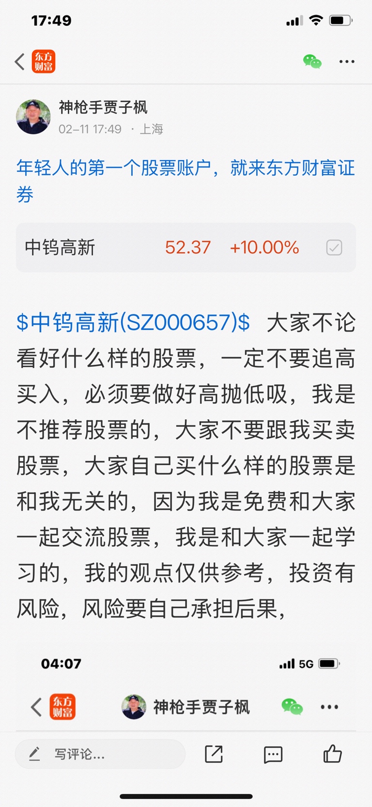 $中钨高新(SZ000657)$ 这个股是我二月十一号发表文章看涨的股票,这个股是我看好的五大钨王中是排名第四位,我是不推荐股票的,大家不要跟我买卖股票,大家自己买什么样的股票是和我无关的,因为我是免费和大家一起交流股票,我是和大家一起学习的,我的观点仅供参考,投资有风险 ,风险要自己承担后果,