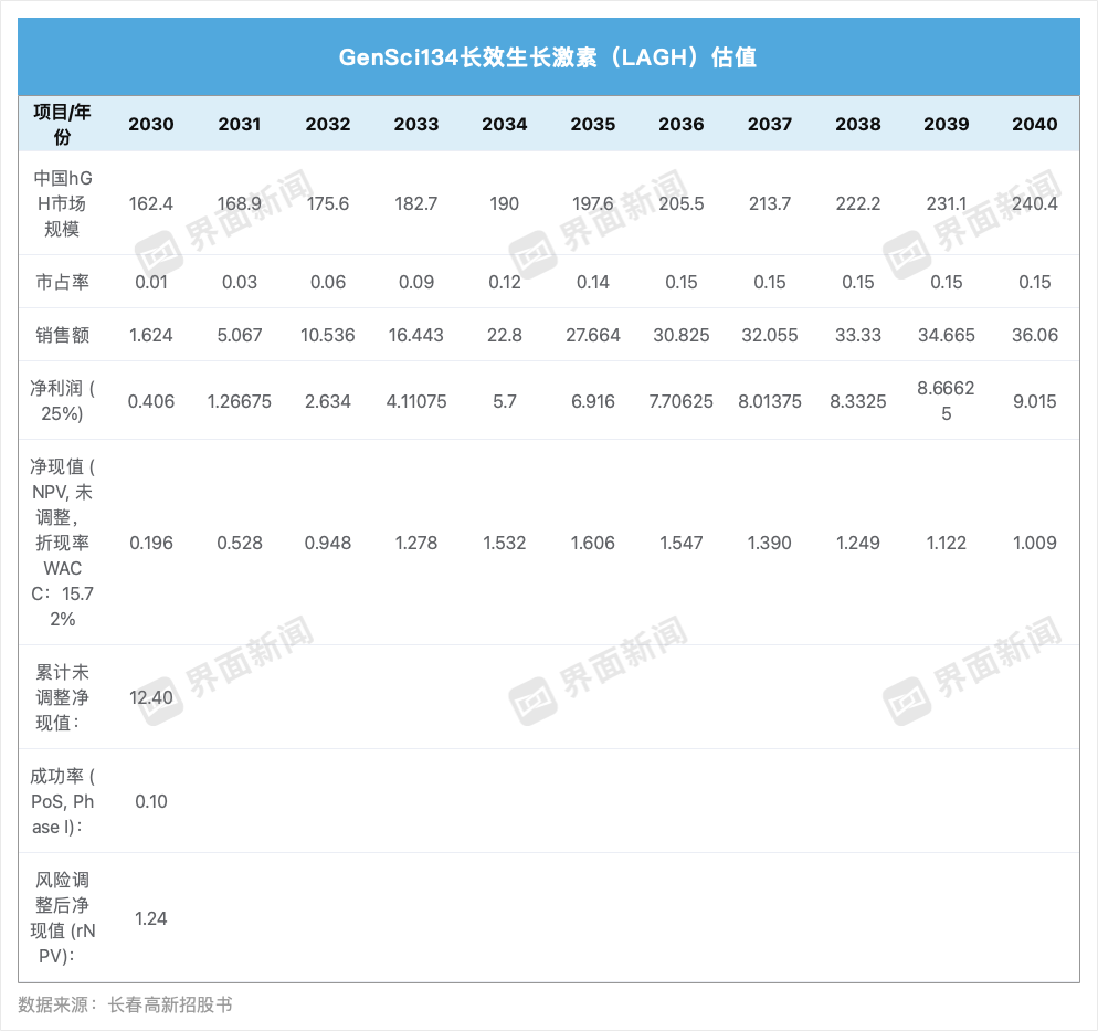 界面新闻根据招股书基于整个生长激素市场规模出发,假设市占率,得到收入和利润,对GenSci134进行简单估值。该方法把所有患者群体(PGHD、ISS、AGHD)合并在一起,忽略了不同适应症的诊断率、竞争格局、支付路径差异。