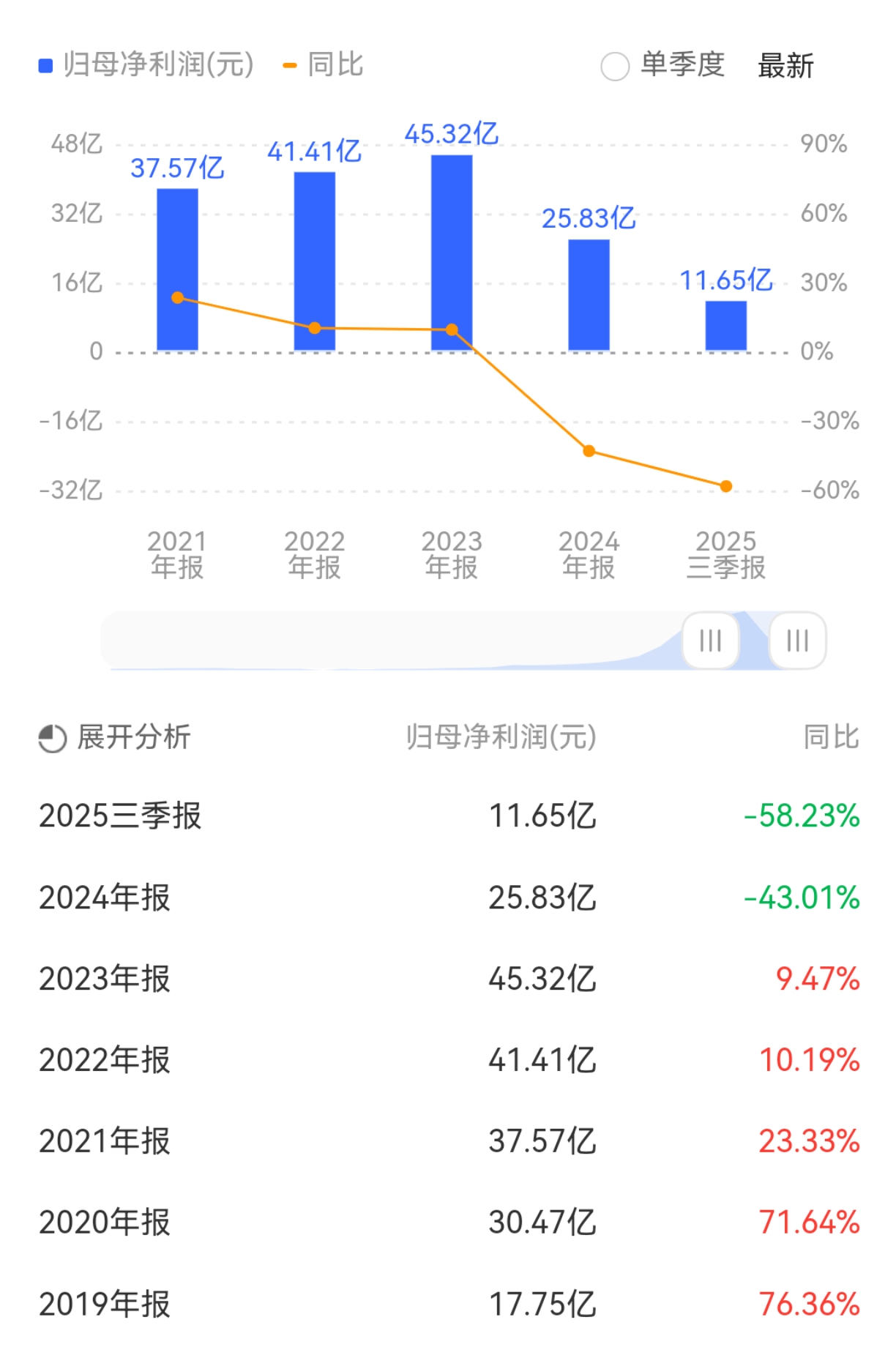 2025年前三季度,公司实现营业总收入98.07亿元,同比下降5.60%;扣非净利润12.69亿元,同比下降55.33%。