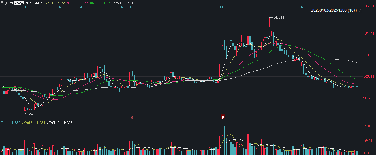 二级市场方面,长春高新目前已跌破100元。截至12月8日收盘,该公司股价报99.20元/股。在历经四年的大幅下跌超过七成,股价仅剩“零头”的情况下,年内仅微幅上涨约2%,走势明显弱于整体医药板块。