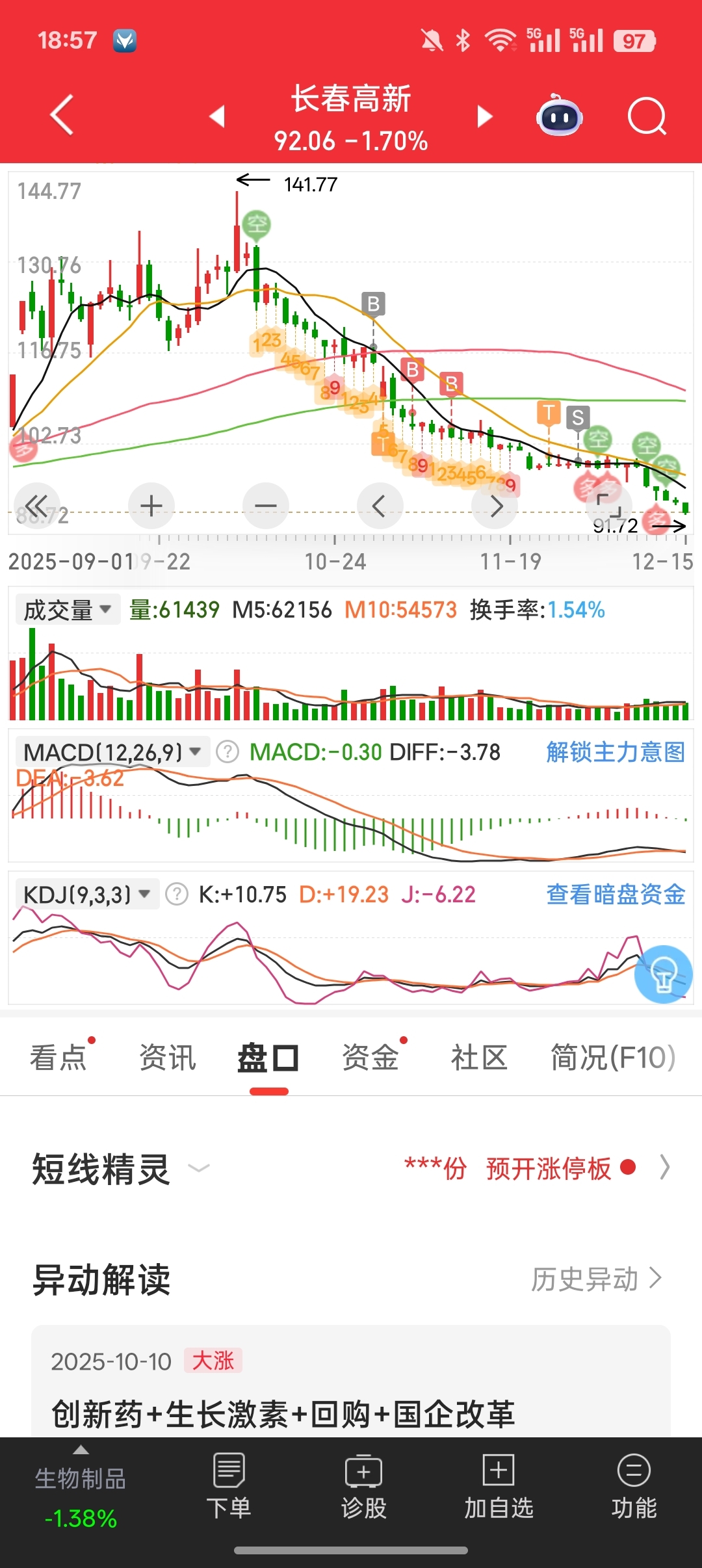 $长春高新(SZ000661)$ 这里的散户可怜苦苦等候,幸亏我那时候割肉离场了,回头一看又跌了这么多,如果不割肉多亏3万多