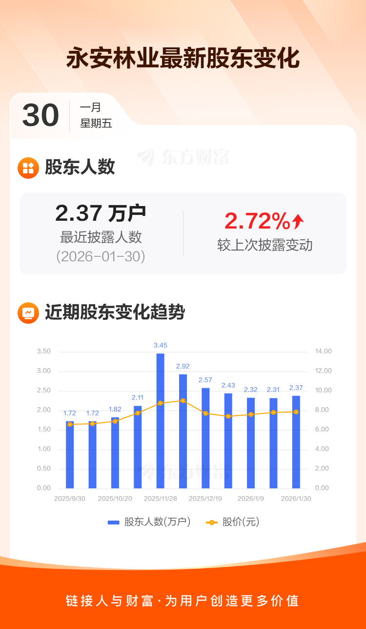 永安林业:截至1月30日最新股东户数2.37万户,较上期增加2.72%