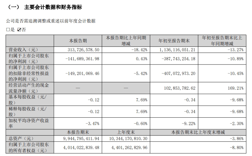 其中第三季度,公司营业收入为3.14亿元,同比下降18.4%;归母净利润亏损1.42亿元;扣非归母净利润自去年同期亏损1.42亿元变为亏损1.49亿元,亏损额进一步扩大;EPS为-0.1246元。