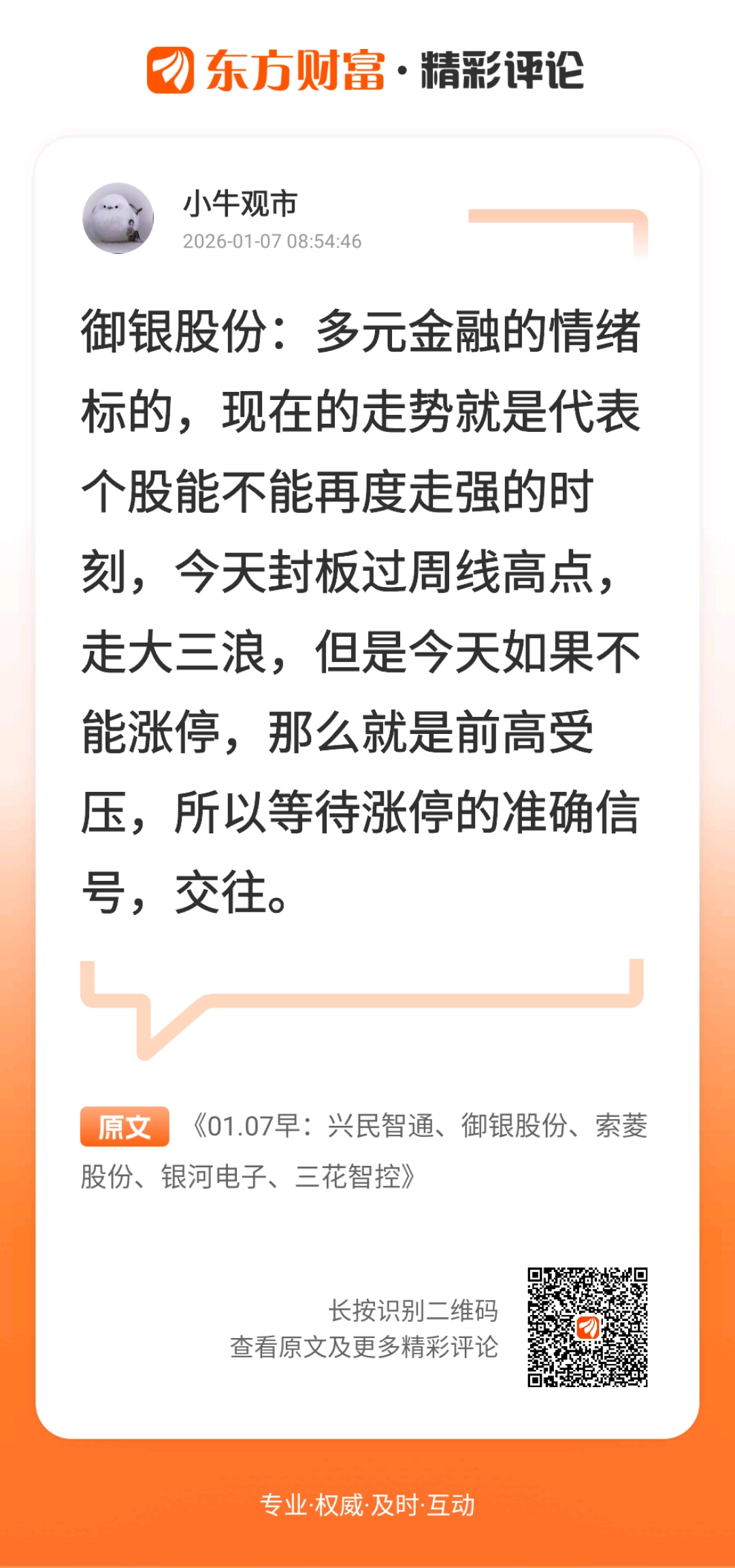 $御银股份(SZ002177)$御银股份:随着股指的强势上涨,出现了相关的多元金融板块整体出现异动的情况,目前标的在上一轮的三连板行情当中,主要受益于数字稳定币的相关的消息面刺激,造成了三连板的结构,随后线路调整,随着整体的市场进入了攻坚的阶段。所以,金融板块整体出现明显上涨,无论是券商、保险都出现集体走高,个股也因此出现反包涨停走势,创出阶段新高,有了挑战前期高点10.40元位置的潜力。如果今天能够有效快速拉升涨停,那么能够突破前面大箱体高点,走出突破结构形态。今天是否能够冲破10.40元,将是决定个股能否有二波行情的关键点。