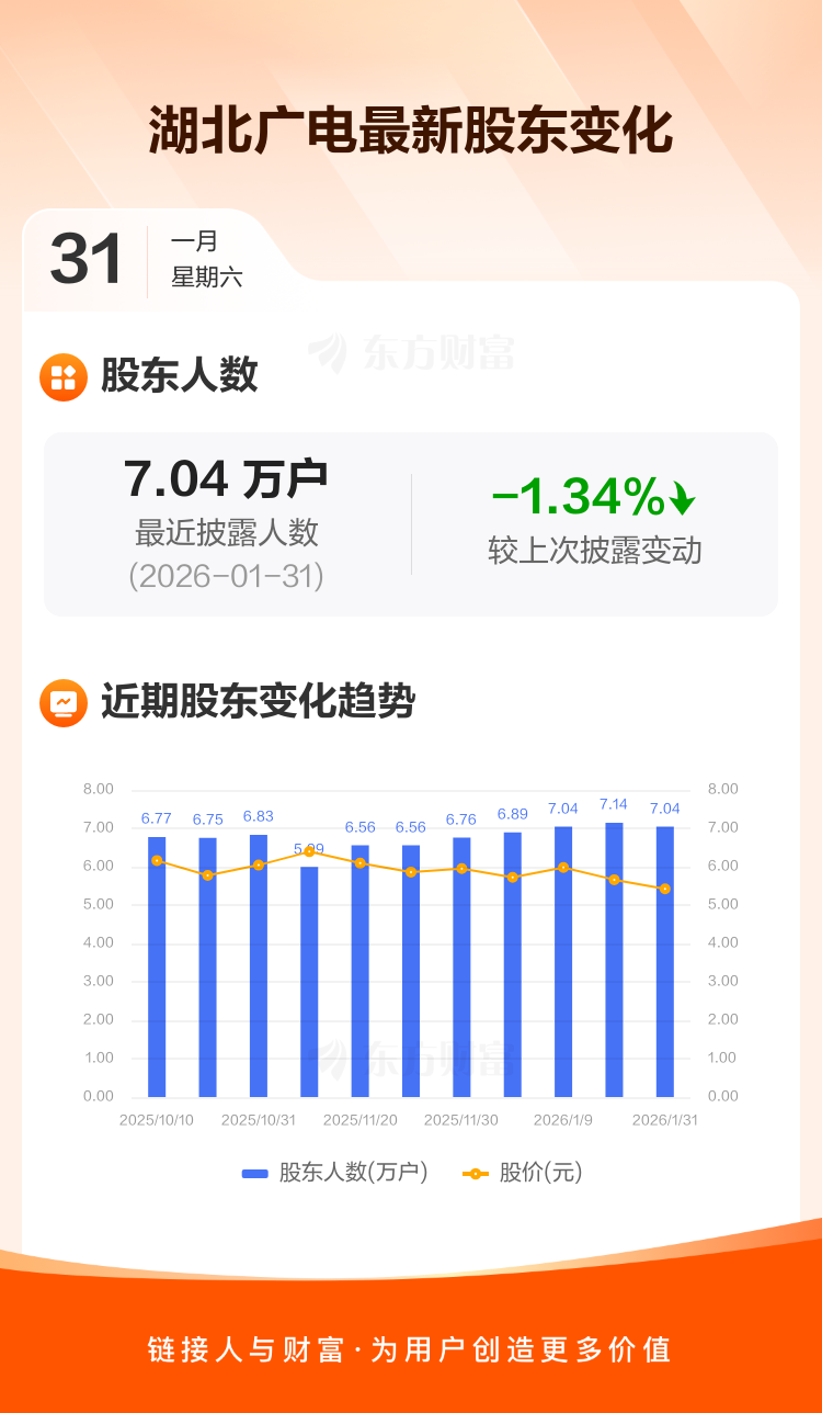 湖北广电最新披露数据显示,截至1月31日公司股东户数为7.04万户,较上期(2026年1月20日)减少956户,降幅为1.34%。户均持有流通股数量由上期的1.59万股上升至1.61万股,户均持股金额由上期的9.01万元减少至8.75万元。