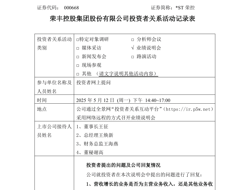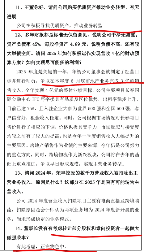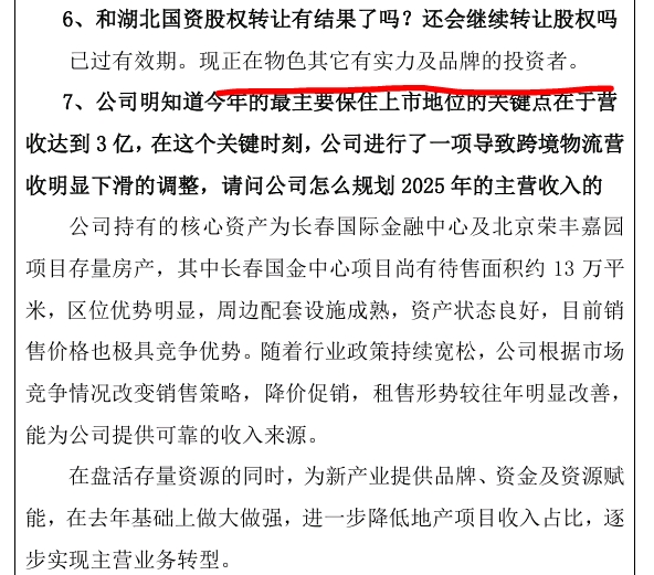 王董属实是不靠谱,5月12号的业绩说明会里承诺在上半年就做到3亿营收,三季报也没在报表里体现出来,说是物色有实力的股权转让方和寻找优质资产那么久也没个信儿,想来还是有的,不至于忽悠咱投资者。一方面股东没有减持,拉高了股价跑路,另一方面等公司把存量地产卖完之后需要新的东西来支持运作,只能通过置出股权或者并购重组来实现,就是办事效率实在不高,等吧
