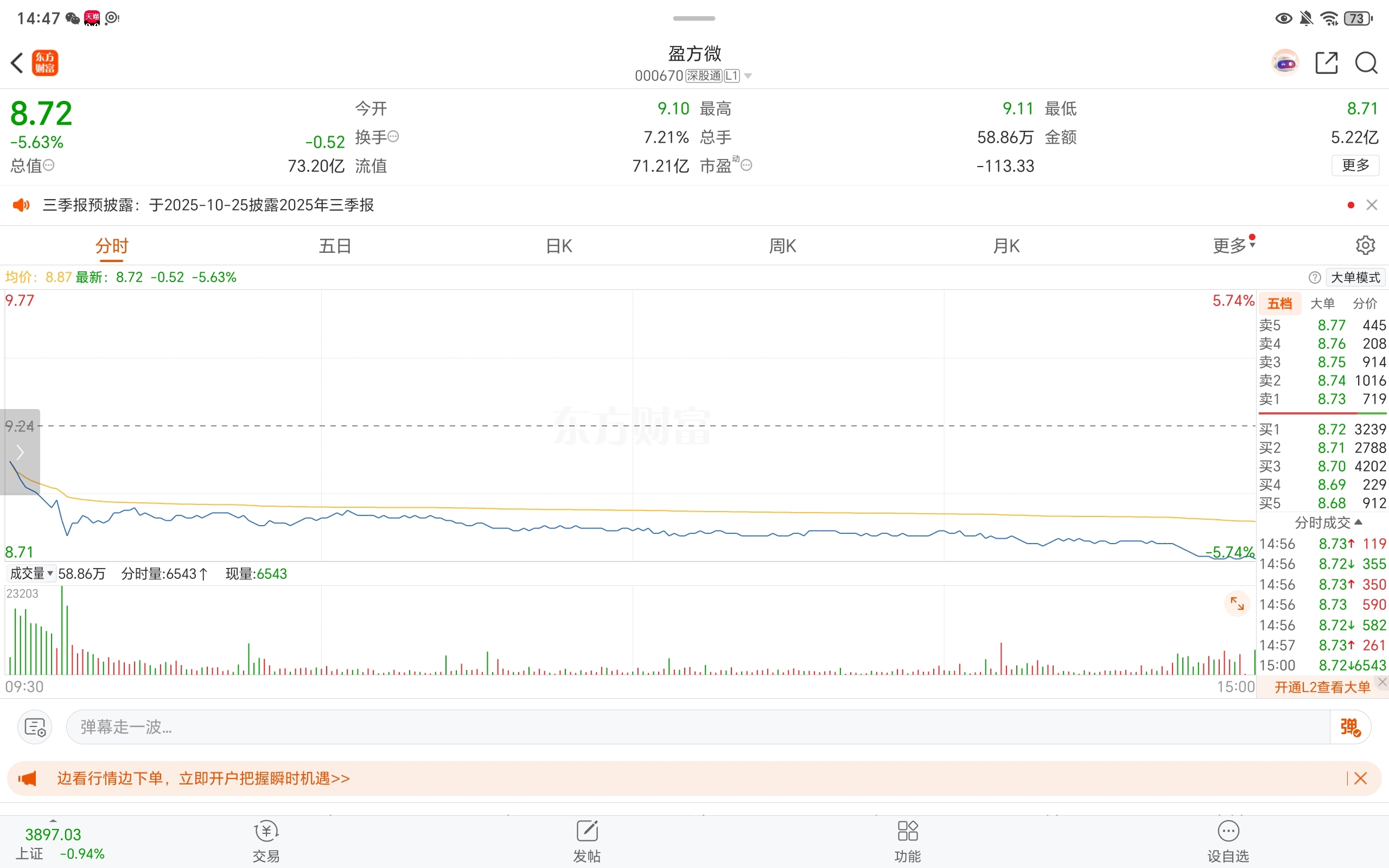 看分时,大盘大幅低开,特别是科技股,盈方微配合大盘开盘大幅度下探,全天平稳小幅度