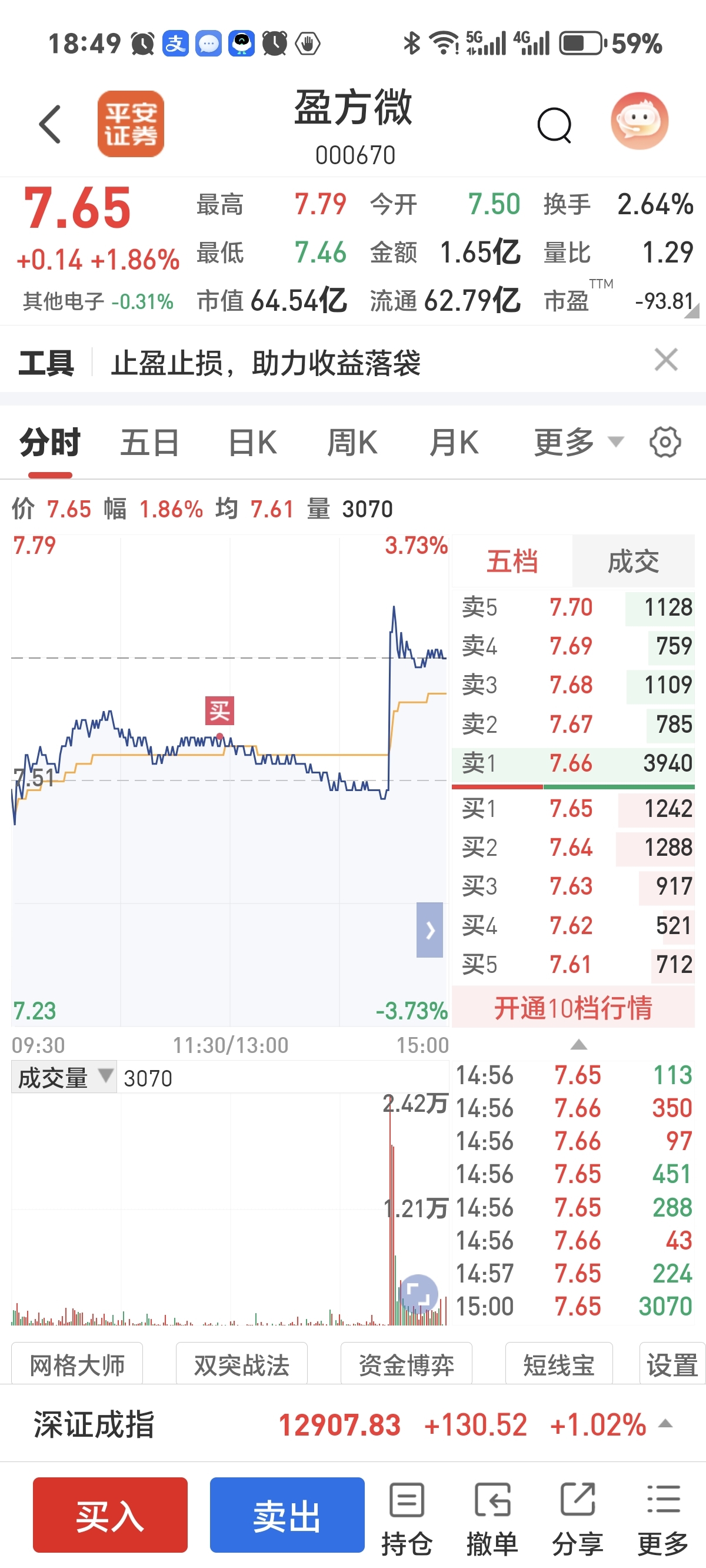 $盈方微(SZ000670)$ 半导体涨,7.56买的本来想做T赚点差价,涨太少等明天再出了,怎么这么多看空的,这价位我还想加仓呢