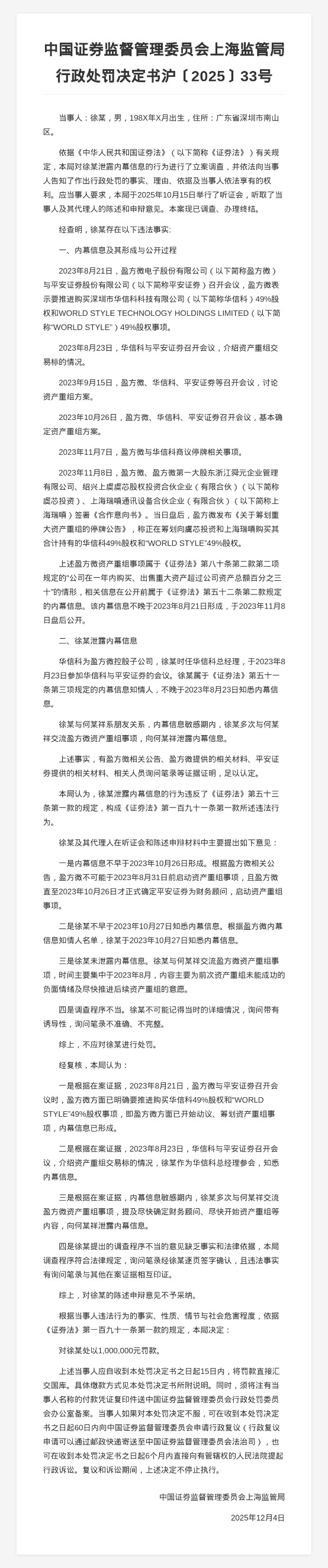 蓝鲸新闻12月23日讯,近日,中国证券监督管理委员会上海监管局发布行政处罚决定书,对徐某泄露内幕信息的行为进行了处罚。