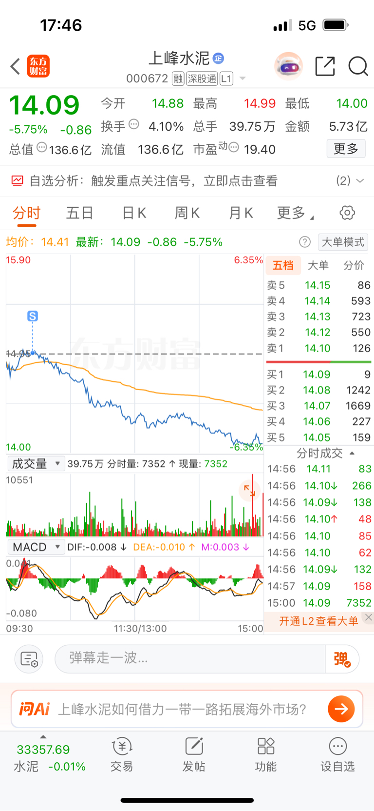 $上峰水泥(SZ000672)$ 太险了