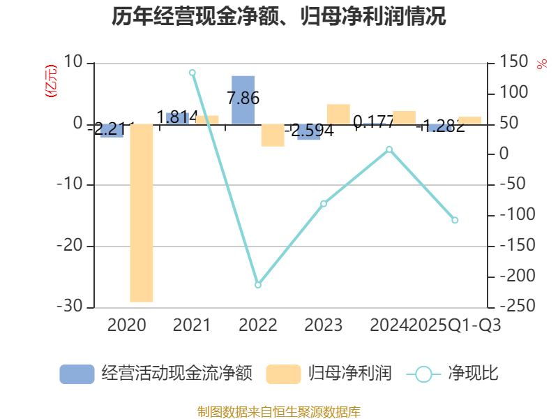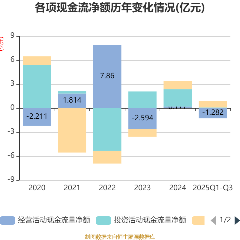 2025年前三季度,公司经营活动现金流净额为-1.28亿元,同比减少7712.62万元;筹资活动现金流净额8101.15万元,同比减少4883.64万元;投资活动现金流净额636.49万元,上年同期为3.47亿元。