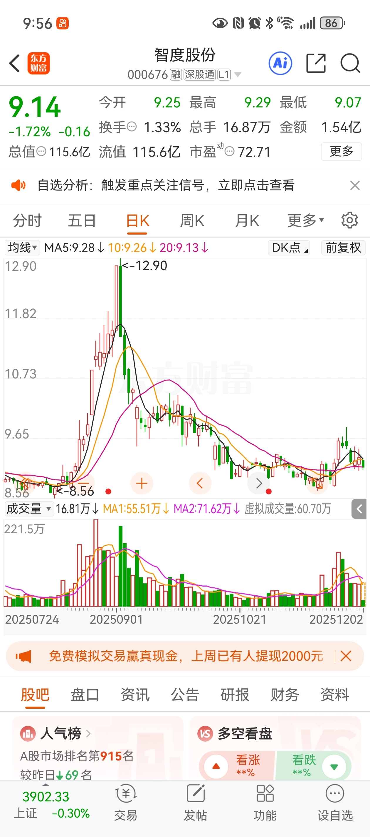 $智度股份(SZ000676)$ 这个价位还能往哪里跌?最差10个点。仁者见仁智者见智,反弹可不是10个点了,主力在砸,破9,继续买!横盘一年了,咋滴,你还想横盘一辈子?