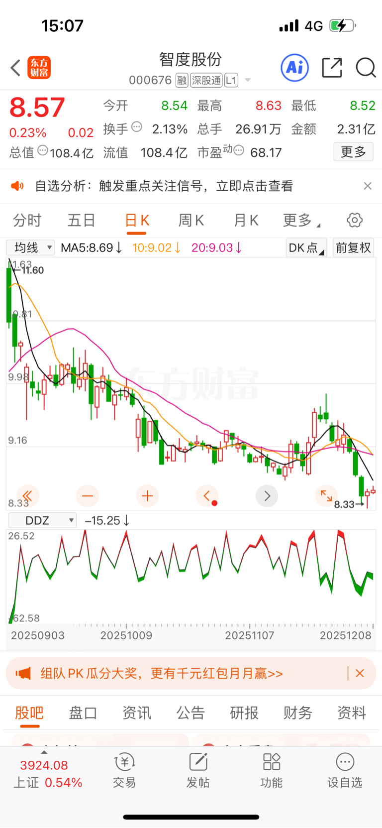 $智度股份(SZ000676)$ 近三个月进来的全埋,做T都没用!大盘涨大涨这出生微涨要么横盘,一旦大盘跌它暴跌!这两日开盘行情那么好主力都在出货!把韭菜都当了!评论区还各种唱多!没买此股的考虑此股风险,我见证它从涨停第二天跌停买进去!到现在一路下滑到八块!