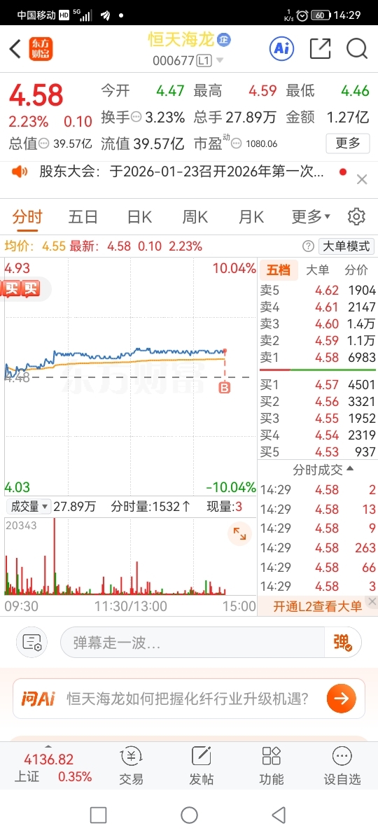 $恒天海龙(SZ000677)$ 尾盘买入,下周吃肉