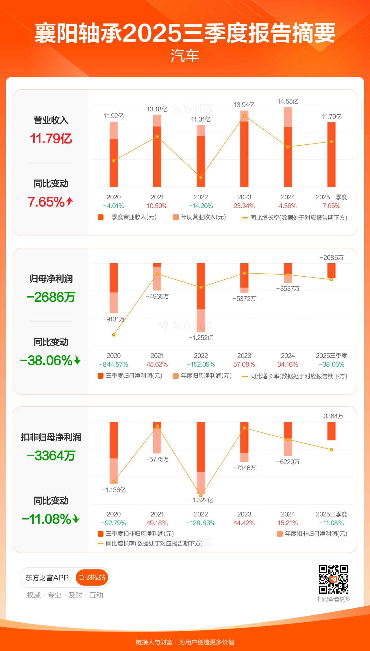 襄阳轴承10月31日发布2025年三季报显示,公司前三季实现营业收入11.79亿元,同比增长7.65%;归母净利润-2685.77万元;扣非归母净利润-3364.04万元。