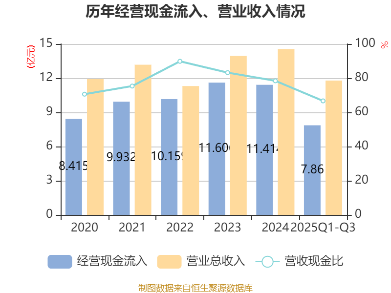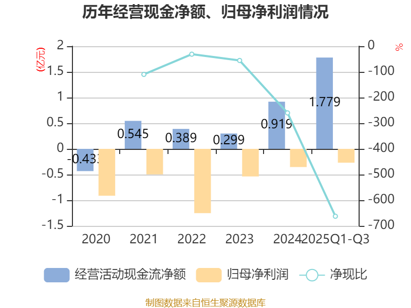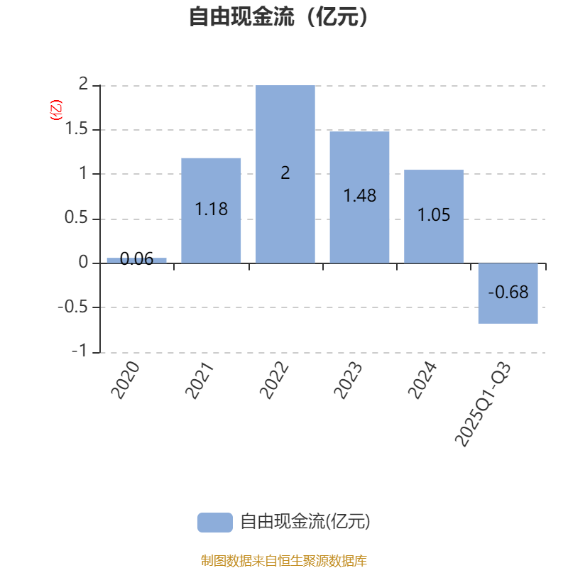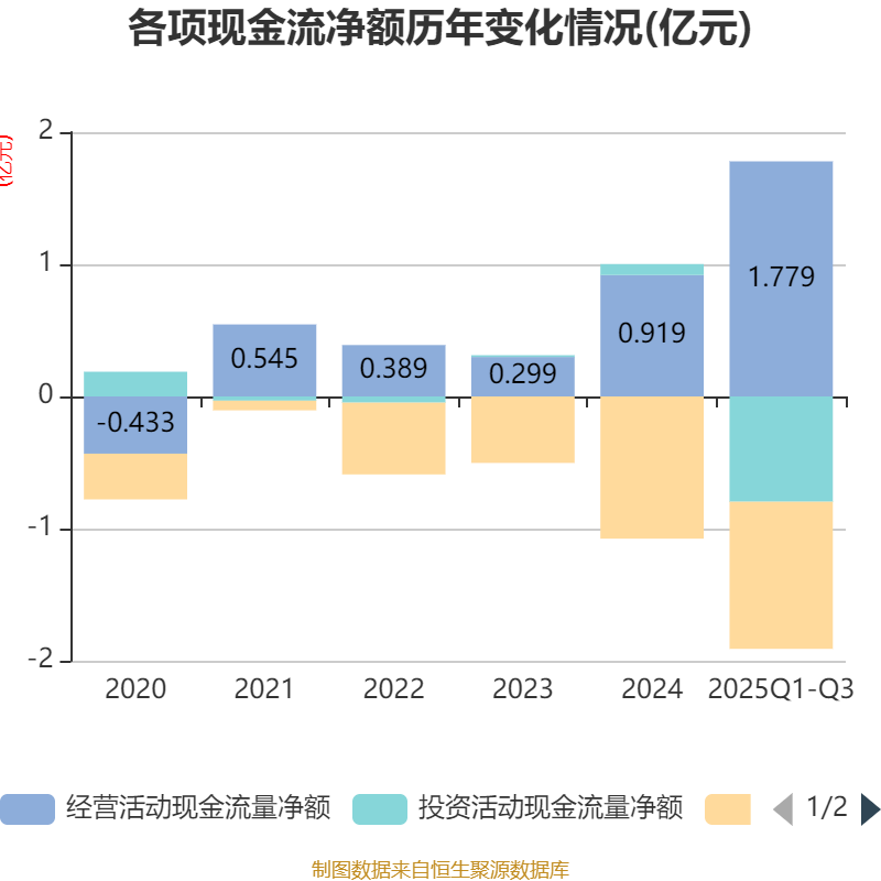 2025年前三季度,公司经营活动现金流净额为1.78亿元,同比下降26.83%;筹资活动现金流净额-1.11亿元,同比增加1.34亿元;投资活动现金流净额-7969.11万元,上年同期为-383.31万元。