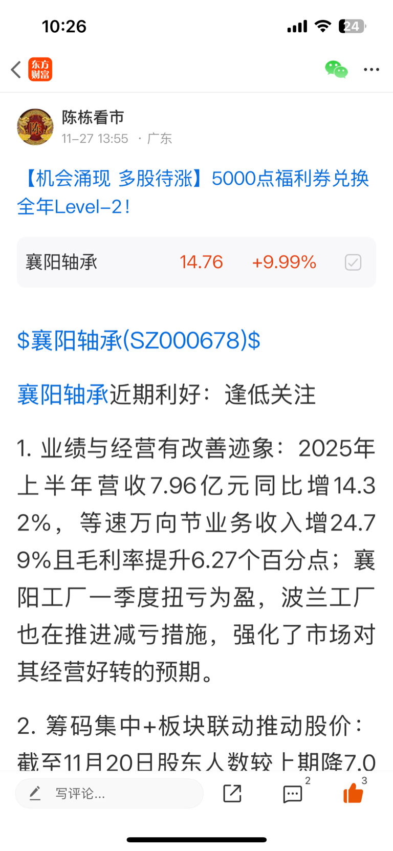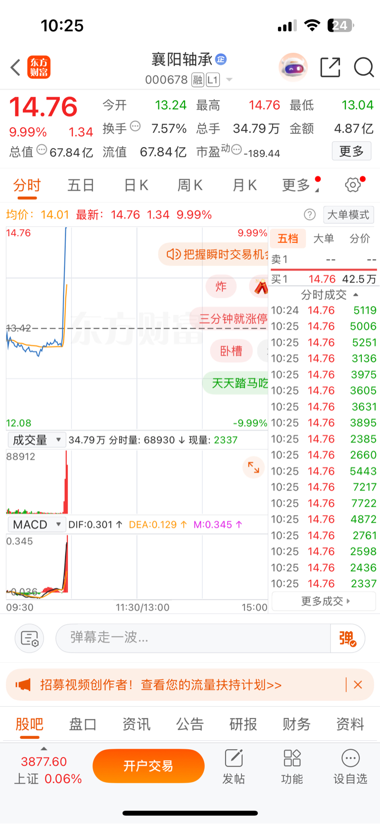 昨天建议低位关注的襄阳轴承一条直线涨停!给力!