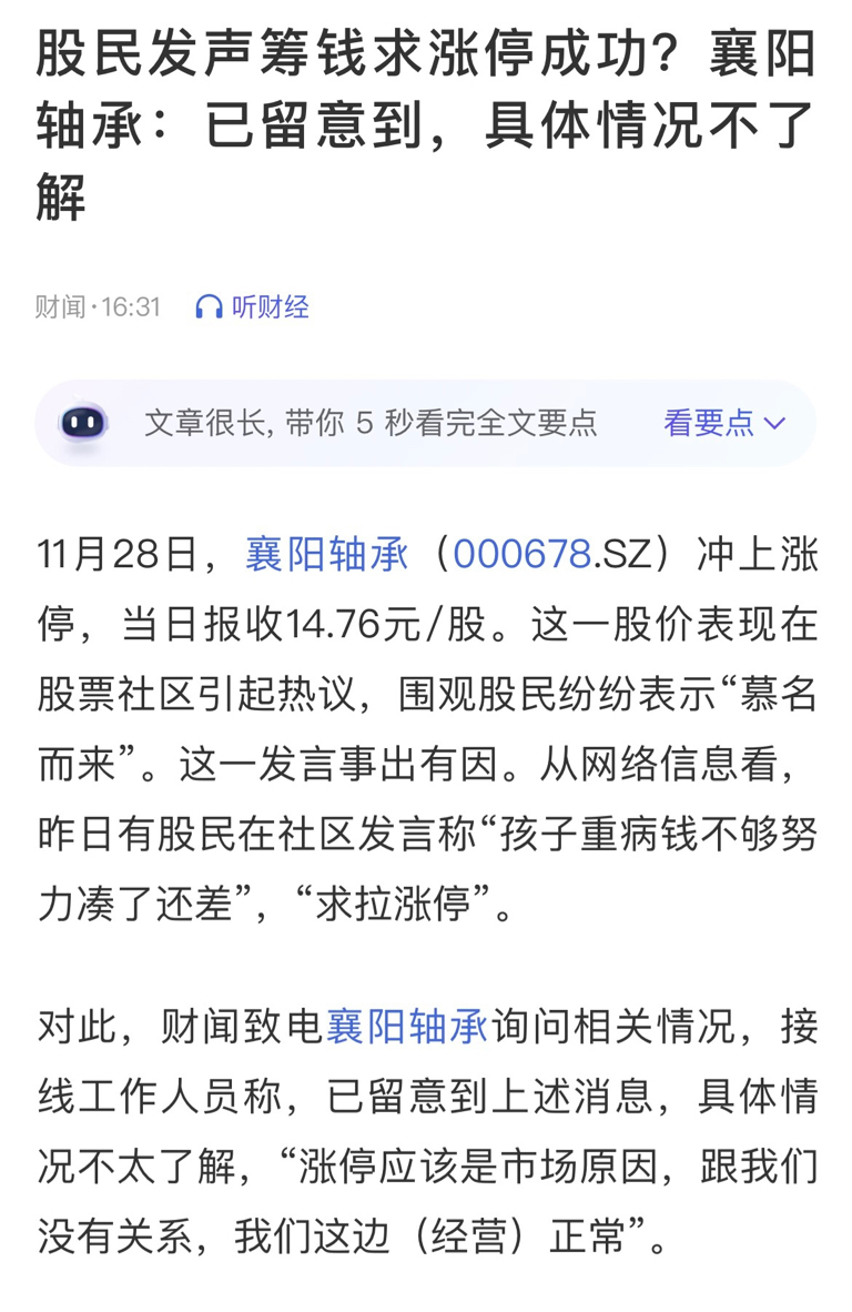 今日,当11月28日的阳光刚漫过A股交易大厅的屏幕,襄阳轴承(000678.SZ)的分时图突然划出一道陡峭的直线——从13.24元到14.76元,5分钟内,9.99%的涨停封单像一堵墙,稳稳接住了这个深秋里最沉重的祈祷。而这道直线的起点,是前一天河南IP下的一条社区留言。"孩子重病钱不够,努力凑了还差,只能在这博一下。"那个网名为"sh_*587lfh"的股民,把给孩子救命的希望,赌在了一条几千字的股票评论里。他说"能行我努力了,不行只能认命",说"永远记着主力恩情",最后那句"我很努力很努力还是很无力",像一根针,扎进了无数股民的屏幕。