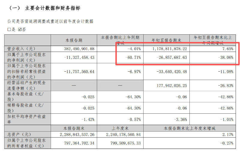 业绩方面,今年前三季度,公司实现营业收入11.79亿元,同比增长7.65%;净利润亏损2685.77万元,下降38.06%。