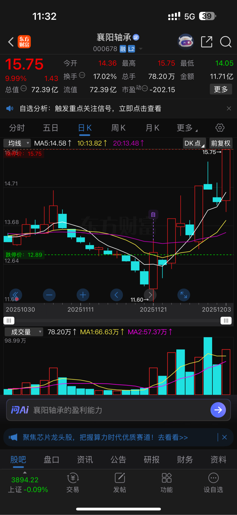 $襄阳轴承(SZ000678)$ 好消息,最低点加入自选,坏消息,没买