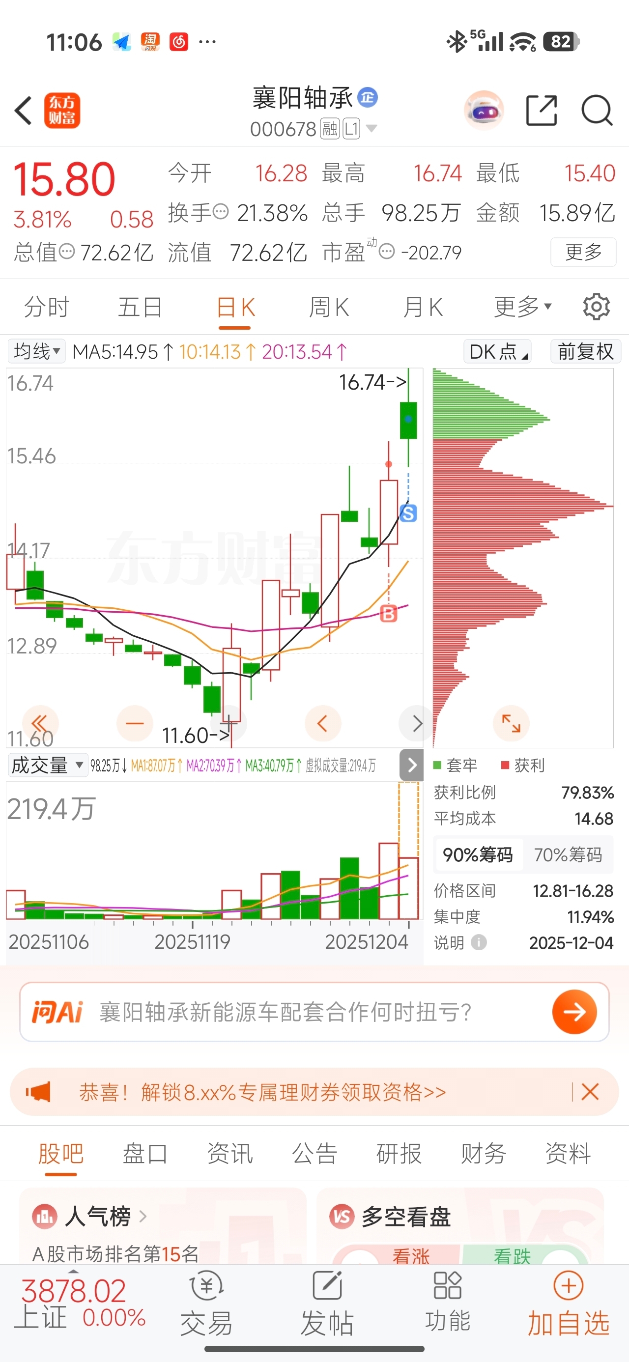 $襄阳轴承(SZ000678)$ 早上工作看倒是刚从板上掉下来,一直在等,又工作一会又掉下来了,只有找机会跑了,可以多放,但是资金体量小。祝大家天天挣日日挣,开开心心的挣大钱