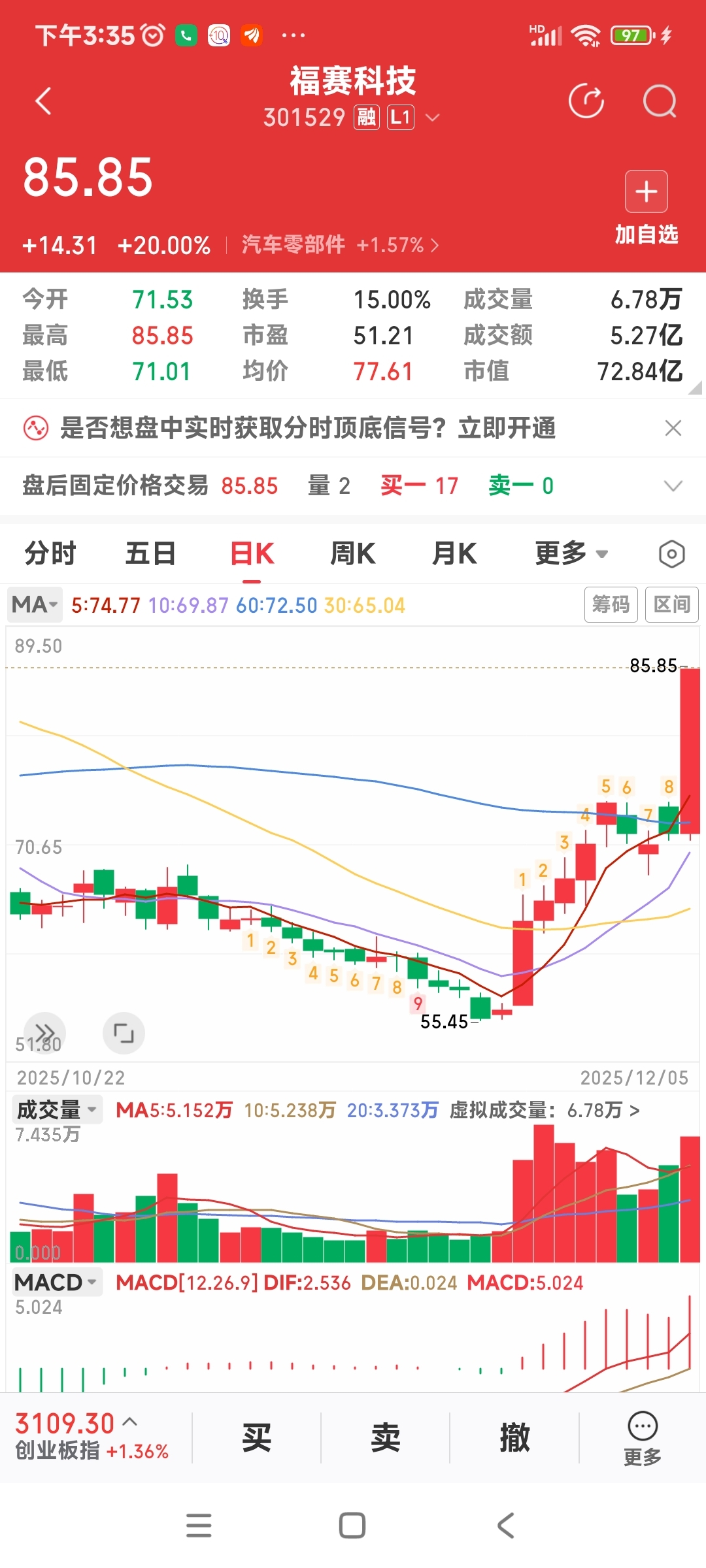 86元汽车零部件福赛5连阳20%突破涨停没见识过真涨的,这货跌回起涨K线……